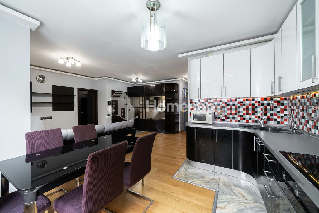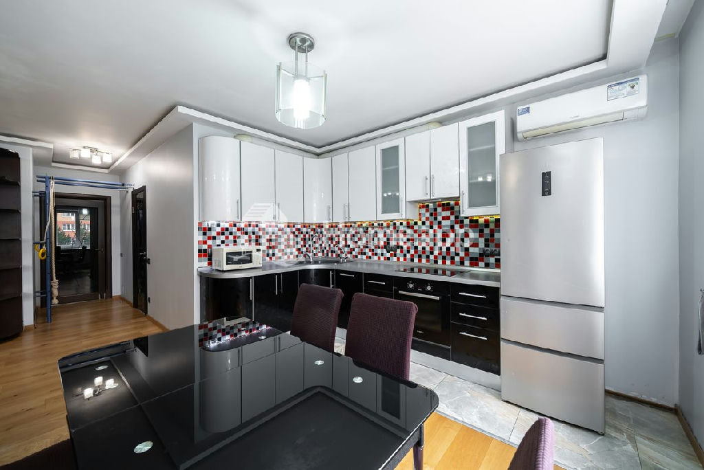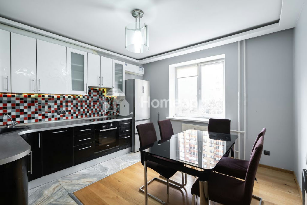 Кухня укомплектована варочной панелью, духовым шкафом, посудомоечной машиной Bosch, холодильником Haier, микроволновой печью, вентиляционной вытяжкой, 3-ступенчатым фильтром питьевой воды, стеклянным раздвижным столом и стульями.